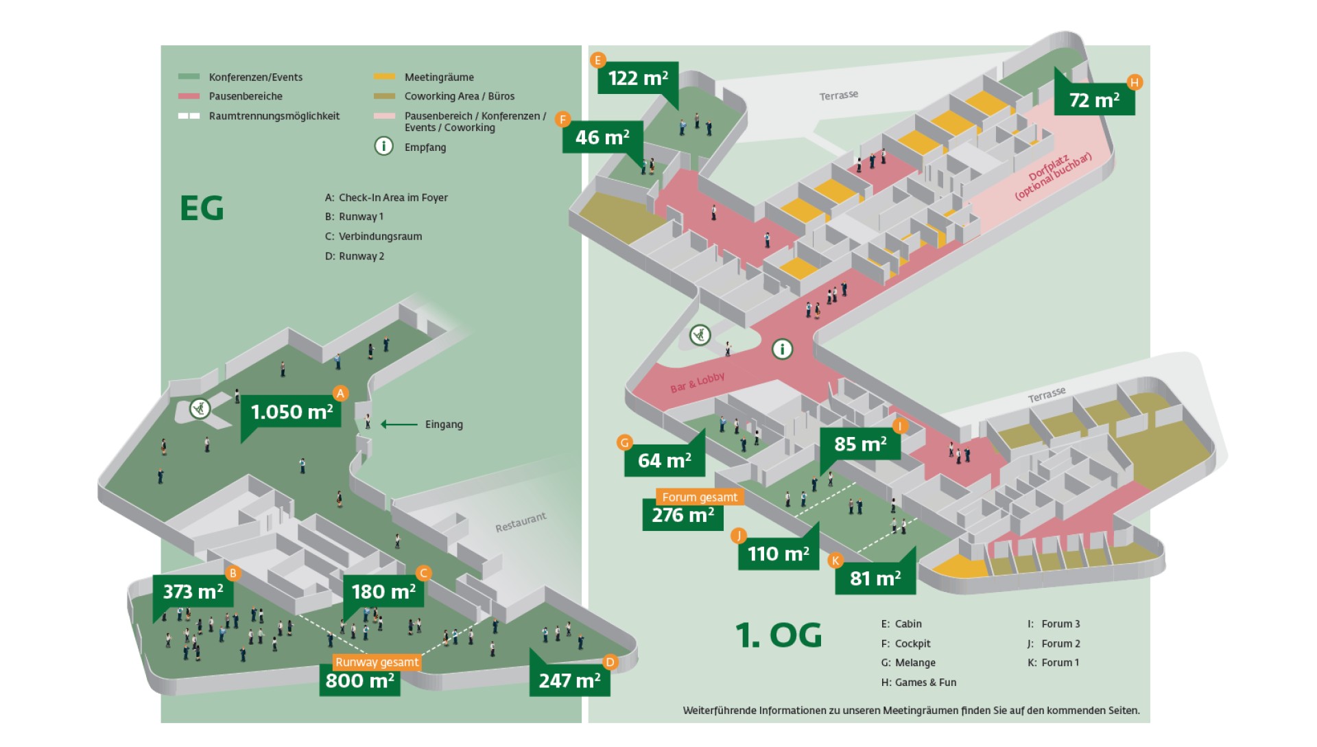 Je nach Bedarf lässt sich die Gesamtfläche auch in kleinere Räume unterteilen. Die weitläufige Check-In Area mit 1.050 m2 im Foyer eignet sich zudem perfekt für Messestände oder als Pausenbereich.