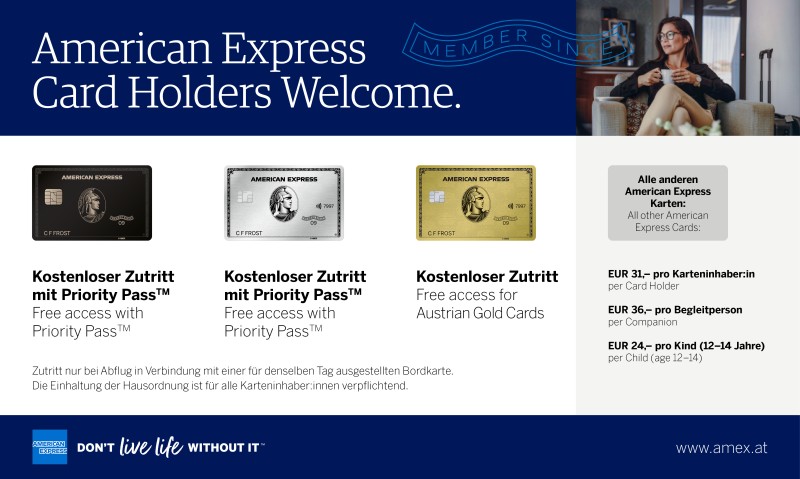 Bezahlung mittels Bankomat- oder Kreditkarte direkt in der Lounge oder Erwerb eines Lounges-Gutscheins vorab möglich.